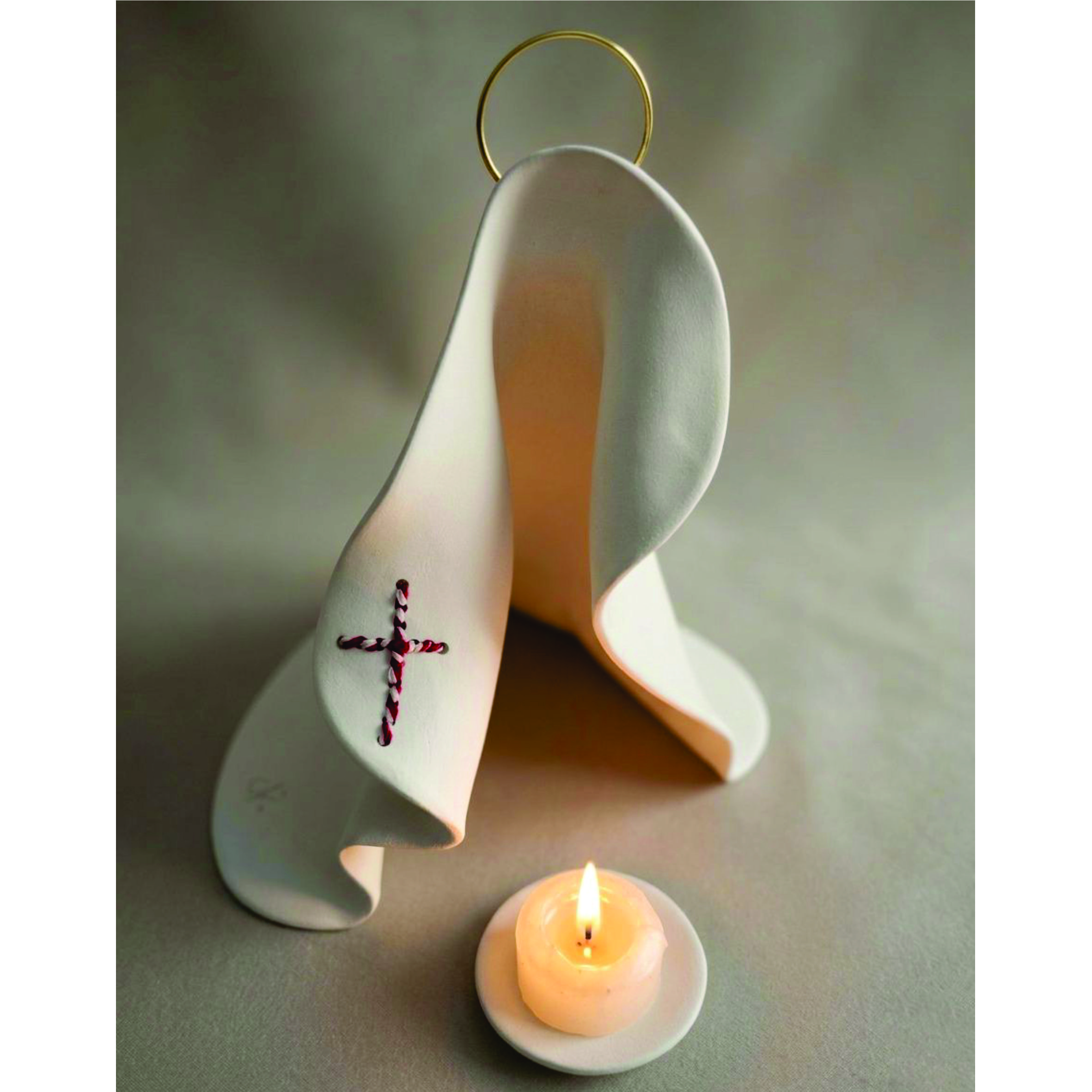 Modelada manualmente em cerâmica fria, com acabamento em esmalte branco que evoca pureza, serenidade e contemplação, a peça é envolvida por um resplendor dourado — representação da luz divina que sustenta e envolve a obra.