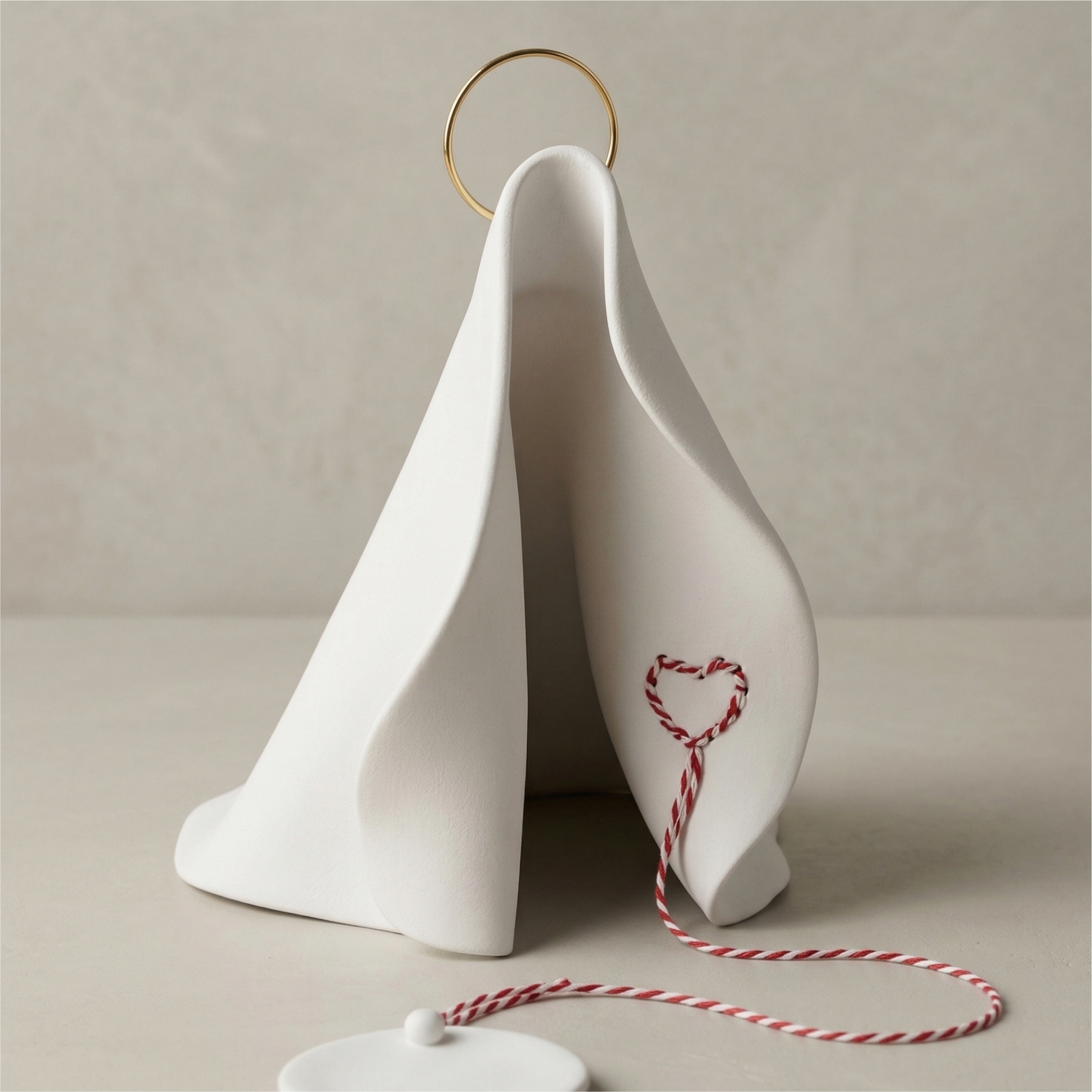 Modelada manualmente em cerâmica fria, com acabamento em esmalte branco que evoca pureza, serenidade e contemplação, a peça é envolvida por um resplendor dourado — representação da luz divina que sustenta e envolve a obra.