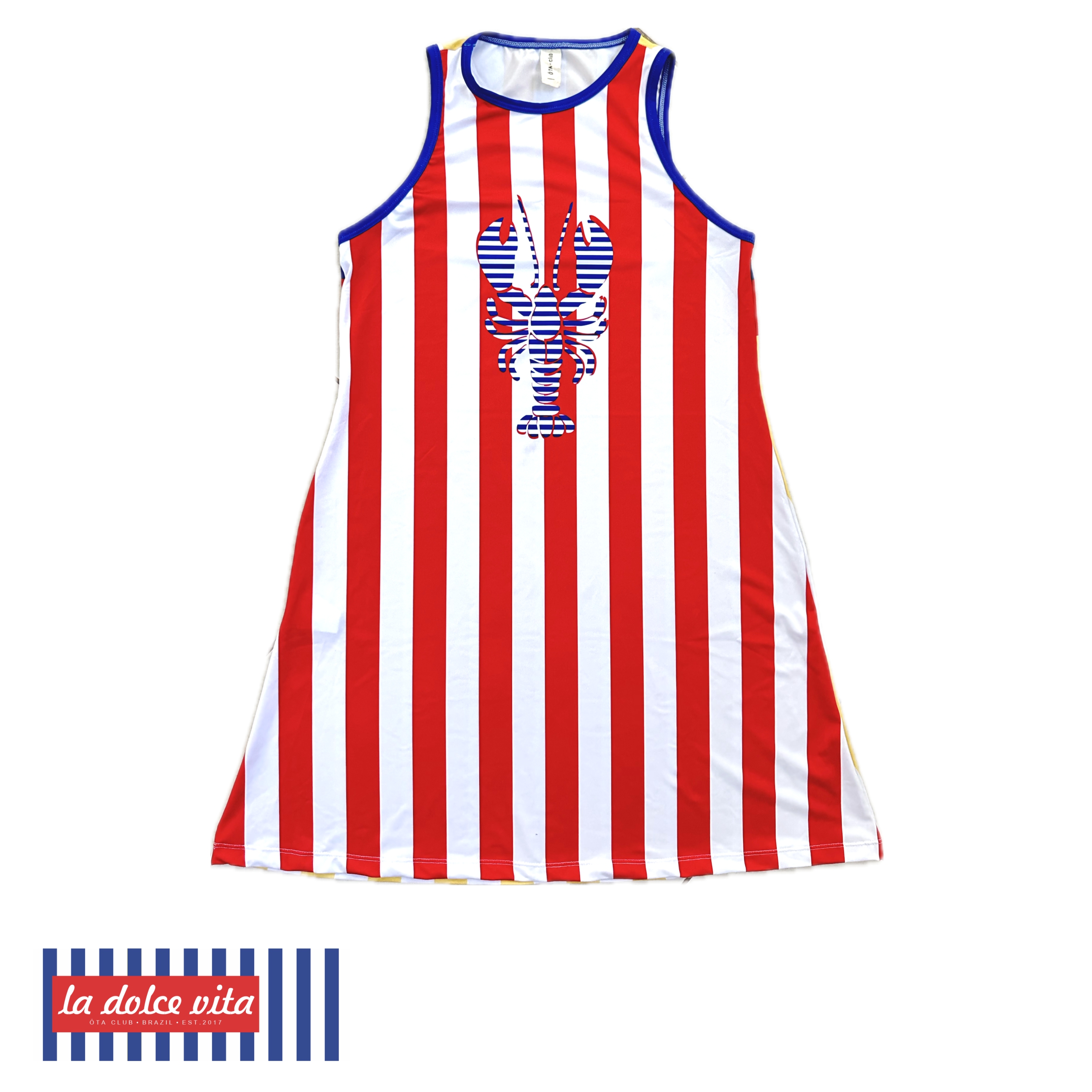 Vestido modelagem trapézio um pouco evasê e levemente acinturado. Cava frontal mais alta. Costas fechadas para evitar marca de sol. A Modelagem é mais curta.